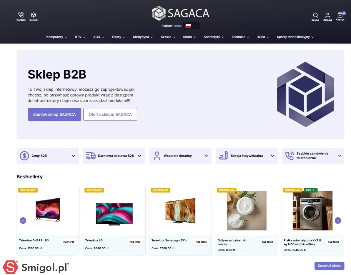 Zbuduj swój własny marketplace na bazie platformy SAGACA i sprzedawaj zarówno detalicznie (B2C), jak i hurtowo (B2B). Nasze rozwiązanie jest skalowalne, nowoczesne i w pełni dostosowane do potrzeb współczesnego e-commerce. Płacisz raz, sklep zostaje Twój.